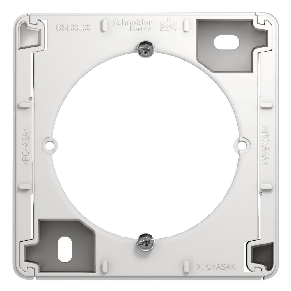 Коробка Systeme Electric (ранее Schneider Electric) серии Glossa (цвет белый) наружного монтажа. Позволяет установить любую функцию скрытого монтажа на стену (как изделие открытого монтажа). Выполнена из материала PС+ASA, стойкого к УФ-излучению и появлению царапин.