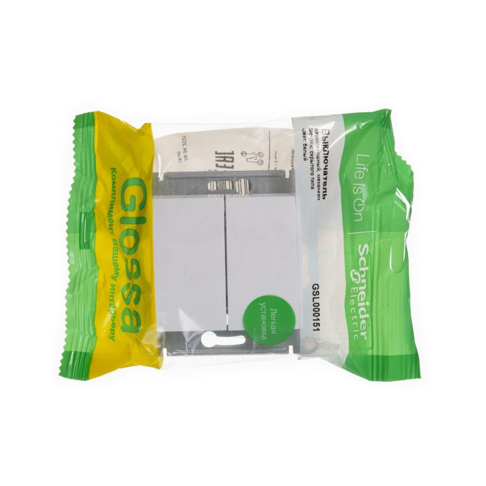 Механизм Systeme Electric (ранее Schneider Electric) серии Glossa (цвет белый) выключателя 2-клавишного подходит для сетей 250 В, на ток 10 А. Двухклавишный выключатель позволяет управлять двумя источниками света с одной точки. Выполнен из материала PС+ASA, стойкого к УФ-излучению и появлению царапин. Эргономичные клеммы расположены в два ряда - сверху и снизу.