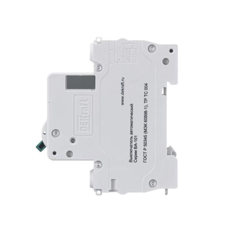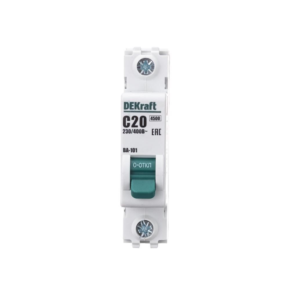 Автоматический выключатель серии ВА-101 DEKraft, 1P, номинальный ток 20 А, характеристика С, отключающая способность 4,5 кА. Новый механизм расцепления мгновенно разрывает цепь при возникновении аварии. 5 монолитных заклепок повышают прочность корпуса аппарата. Сплошная лицевая панель обеспечивает безопасность эксплуатации аппарата. Боковые каналы охлаждения повышают стабильность работы при высоких температурах окружающей среды. Полностью автоматизированный контроль качества производства.