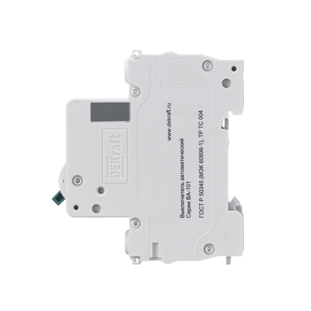 Автоматический выключатель серии ВА-101 DEKraft, 1P, номинальный ток 63 А, характеристика С, отключающая способность 4,5 кА. Новый механизм расцепления мгновенно разрывает цепь при возникновении аварии. 5 монолитных заклепок повышают прочность корпуса аппарата. Сплошная лицевая панель обеспечивает безопасность эксплуатации аппарата. Боковые каналы охлаждения повышают стабильность работы при высоких температурах окружающей среды. Полностью автоматизированный контроль качества производства.