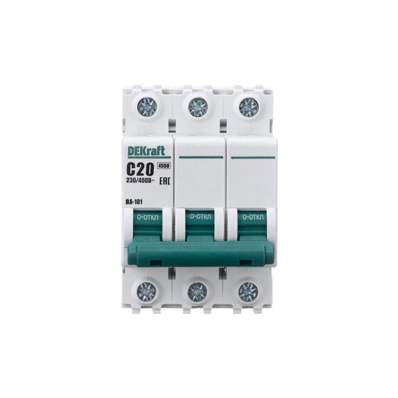 Автоматический выключатель серии ВА-101 DEKraft, 3P, номинальный ток 20 А, характеристика С, отключающая способность 4,5 кА. Новый механизм расцепления мгновенно разрывает цепь при возникновении аварии. 5 монолитных заклепок повышают прочность корпуса аппарата. Сплошная лицевая панель обеспечивает безопасность эксплуатации аппарата. Боковые каналы охлаждения повышают стабильность работы при высоких температурах окружающей среды. Полностью автоматизированный контроль качества производства.