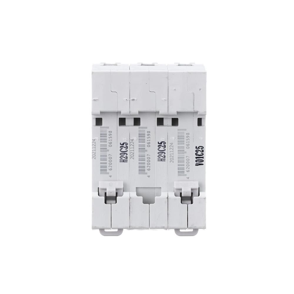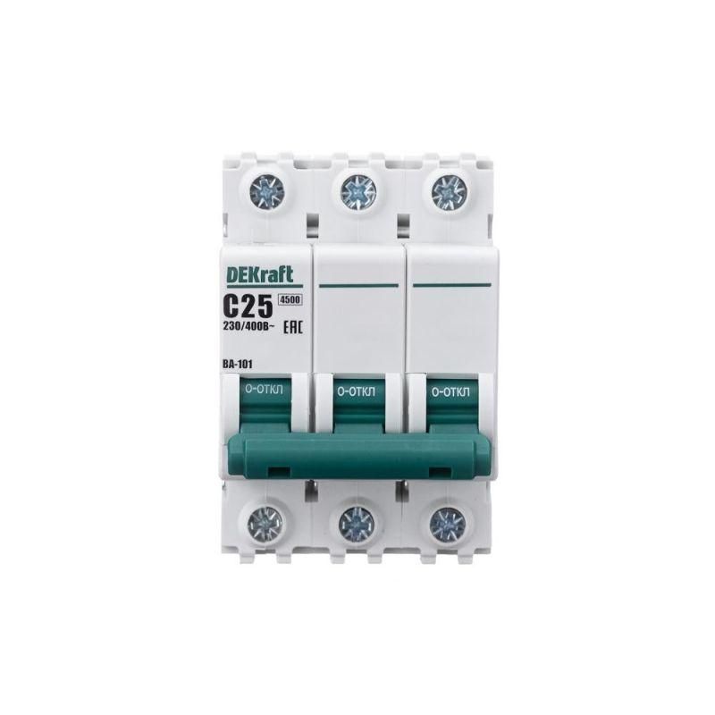 Автоматический выключатель серии ВА-101 DEKraft, 3P, номинальный ток 25 А, характеристика С, отключающая способность 4,5 кА. Новый механизм расцепления мгновенно разрывает цепь при возникновении аварии. 5 монолитных заклепок повышают прочность корпуса аппарата. Сплошная лицевая панель обеспечивает безопасность эксплуатации аппарата. Боковые каналы охлаждения повышают стабильность работы при высоких температурах окружающей среды. Полностью автоматизированный контроль качества производства.