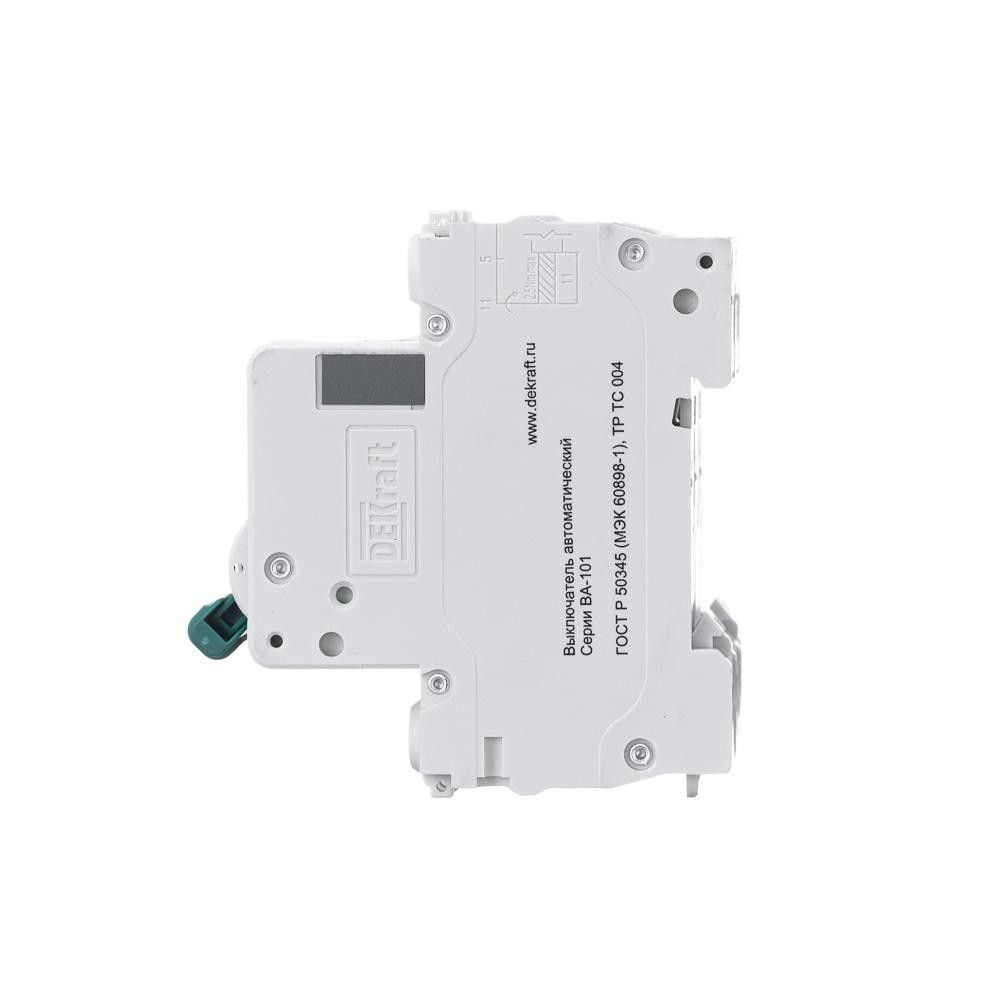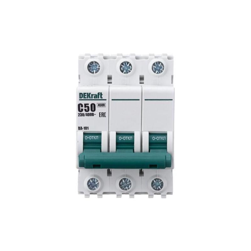 Автоматический выключатель серии ВА-101 DEKraft, 3P, номинальный ток 50 А, характеристика С, отключающая способность 4,5 кА. Новый механизм расцепления мгновенно разрывает цепь при возникновении аварии. 5 монолитных заклепок повышают прочность корпуса аппарата. Сплошная лицевая панель обеспечивает безопасность эксплуатации аппарата. Боковые каналы охлаждения повышают стабильность работы при высоких температурах окружающей среды. Полностью автоматизированный контроль качества производства.