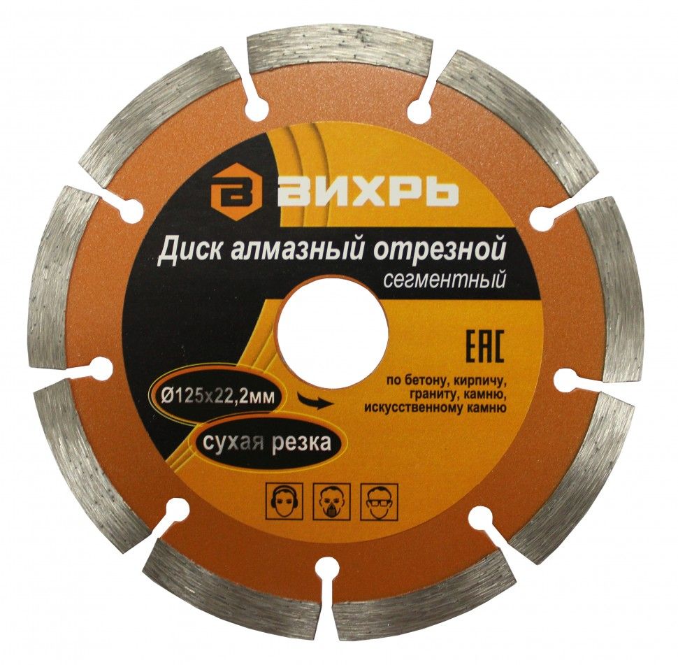 Диск алмазный отрезной сегментный 125 х 22,2 мм, сухая резка Вихрь - это алмазный отрезной диск, который используется совместно с угловыми шлифмашинами (болгарками) для сухой резки гранитных, бетонных, кирпичных и каменных изделий. Благодаря наличию ''прорезей'' сегментов в диске процесс обработки осуществляется с эффективным выбросом продуктов резания.