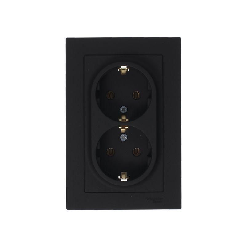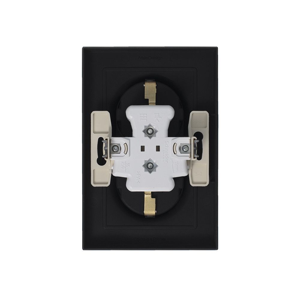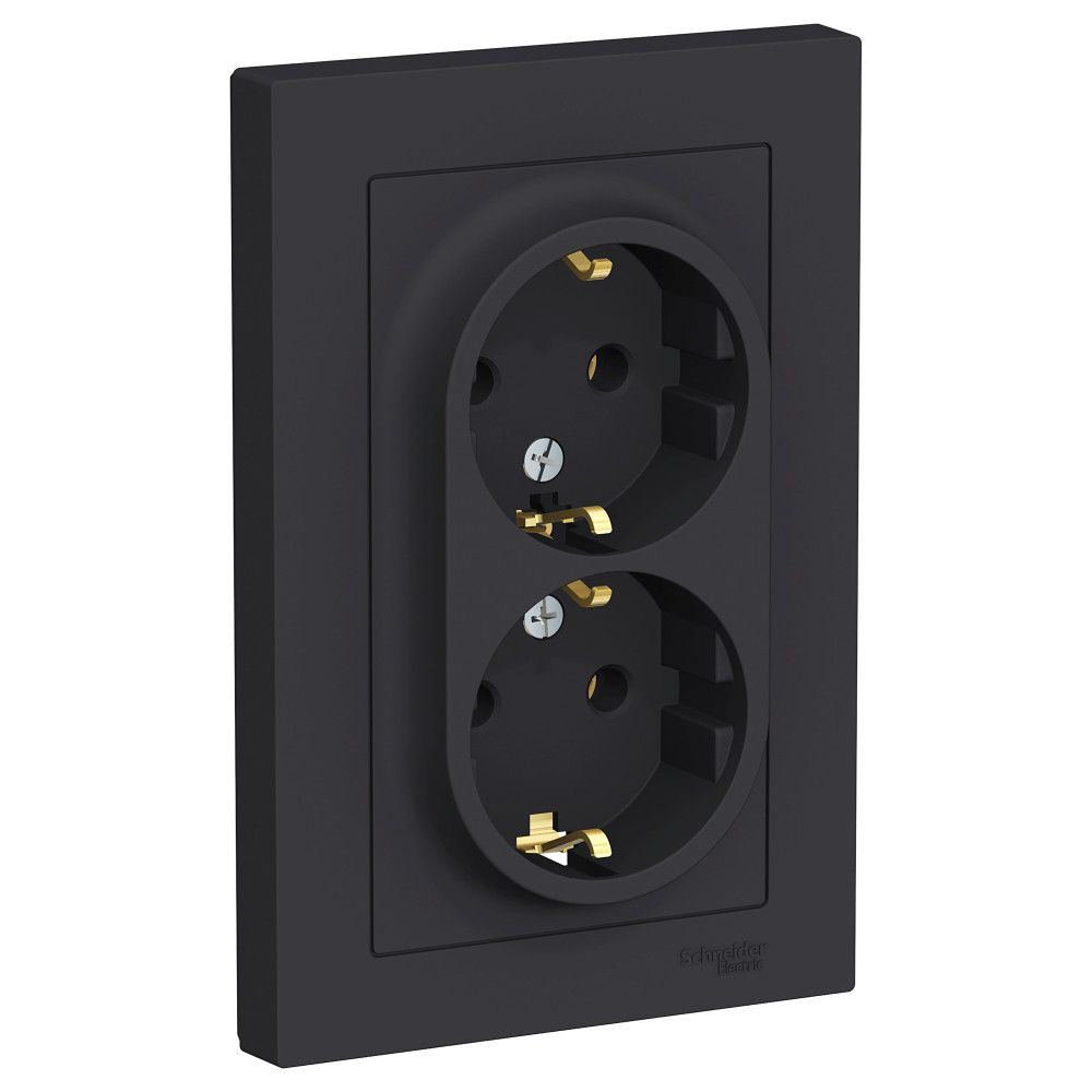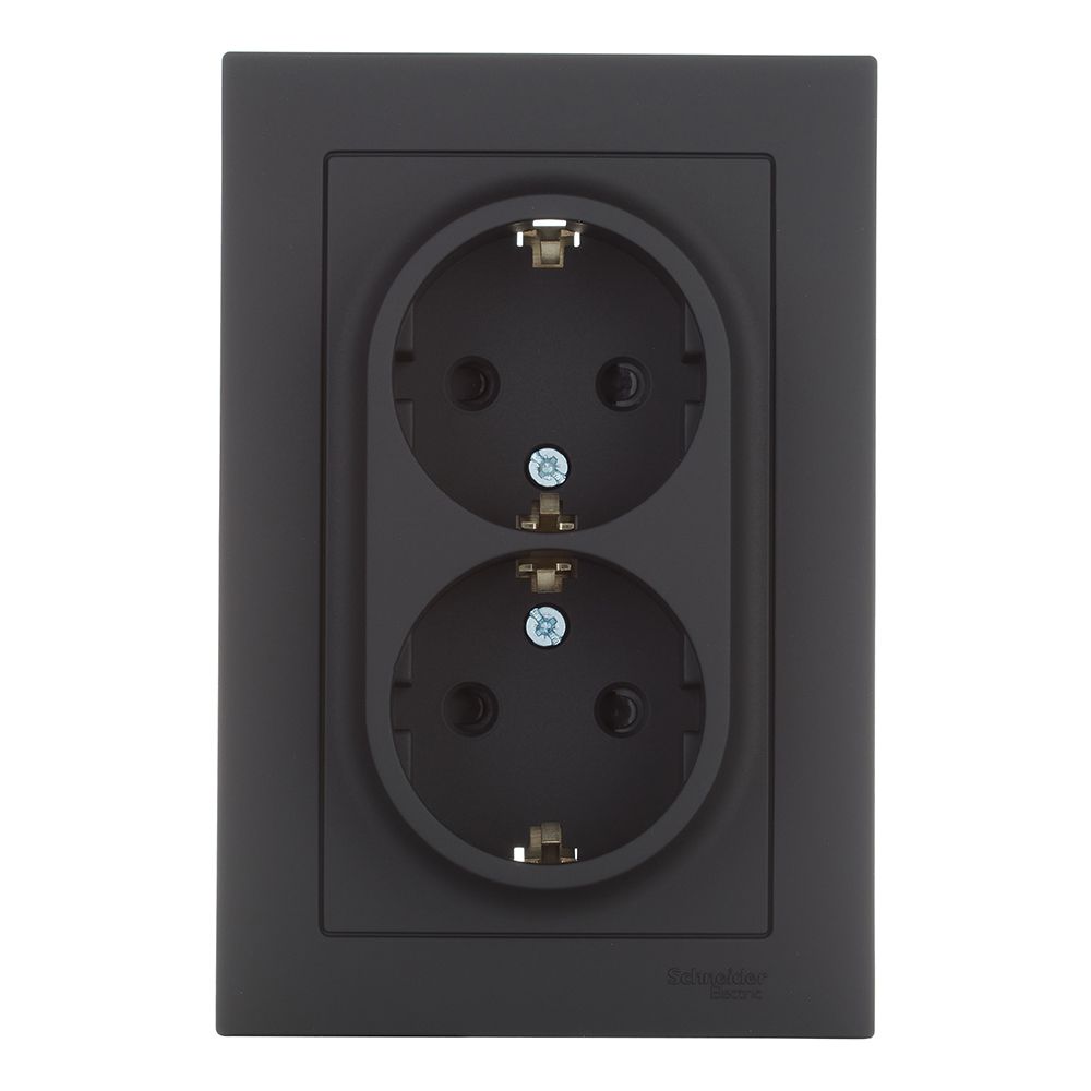 Розетка двойная Systeme Electric (ранее Schneider Electric) серии AtlasDesign (в сборе, цвет карбон) с заземлением, без шторок подходит для сетей 250 В, на ток 16 А. Заземляющий контакт обеспечивает дополнительную защиту от удара электрическим током. Двойная розетка позволяет подключить два устройства в одном месте. Изделие поставляется в комплекте с рамкой того же цвета. Благодаря покрытию ''soft touch'' к изделию приятно прикасаться.