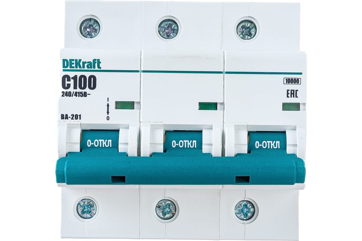 Автоматический выключатель серии ВА-201 DEKraft, 3P, номинальный ток 100 А, характеристика С, отключающая способность 10 кА, ширина - 4,5 мод. х 18мм. Монолитная лицевая панель обеспечивает безопасную эксплуатацию аппарата. Окошко-индикатор всегда показывает состояние аппарата вне зависимости от положения рукоятки управления. Двухпозиционная защелка облегчает монтаж выключателя. Клеммы рассчитаны на подключение проводников сечением до 35 кв.мм.